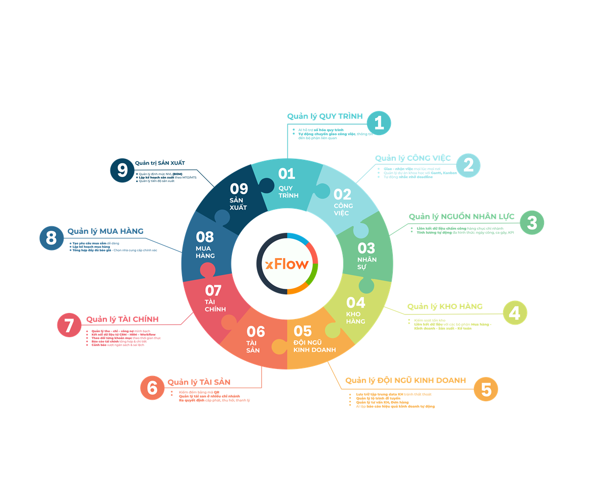 xFlow kết nối toàn bộ hoạt động từ công việc, nhân sự, khách hàng đến tài chính vào một luồng dữ liệu thống nhất, giúp ra quyết định nhanh và chính xác.